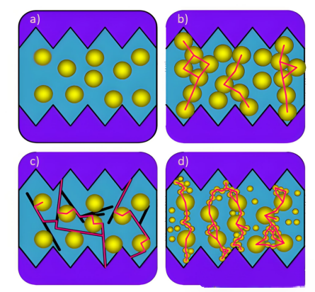 Pengisi membentuk saluran kekonduksian terma berterusan dalam matriks polimer, di mana aliran haba ditransmisikan, melangkaui kawasan rintangan terma yang tinggi dalam matriks. Apabila kandungan pengisi rendah, taburan rawak mereka menjadikannya sukar untuk membentuk laluan yang berkesan; Apabila pengisi meningkat, mereka bersentuhan dengan satu sama lain untuk membentuk struktur rantai atau rangkaian, dengan ketara meningkatkan kekonduksian terma.